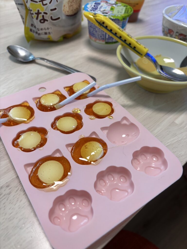 DAISOで買ってきた猫型のシリコン容器を使って男2人で黙々と作っていました😆
