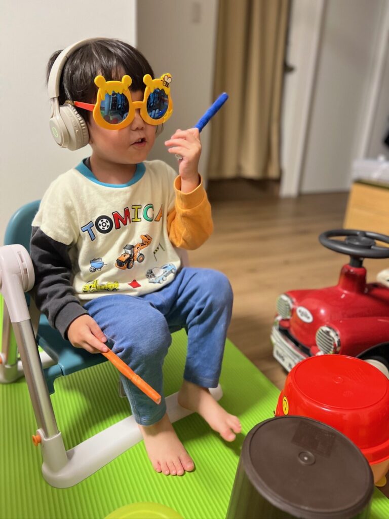 パパが作ってくれたバチと、ヘッドフォンでドラマーになりきっていて最高👏