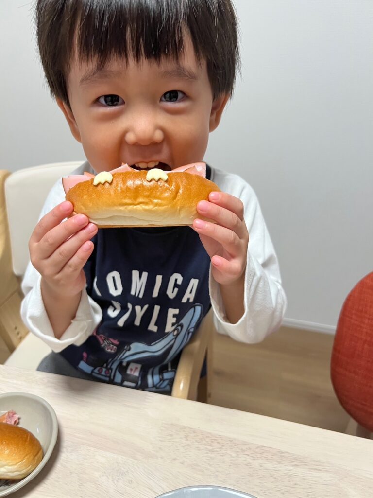 もらって帰ってきた日に「夜ごはんこれがいい!!!」とパンを指さす…。