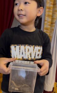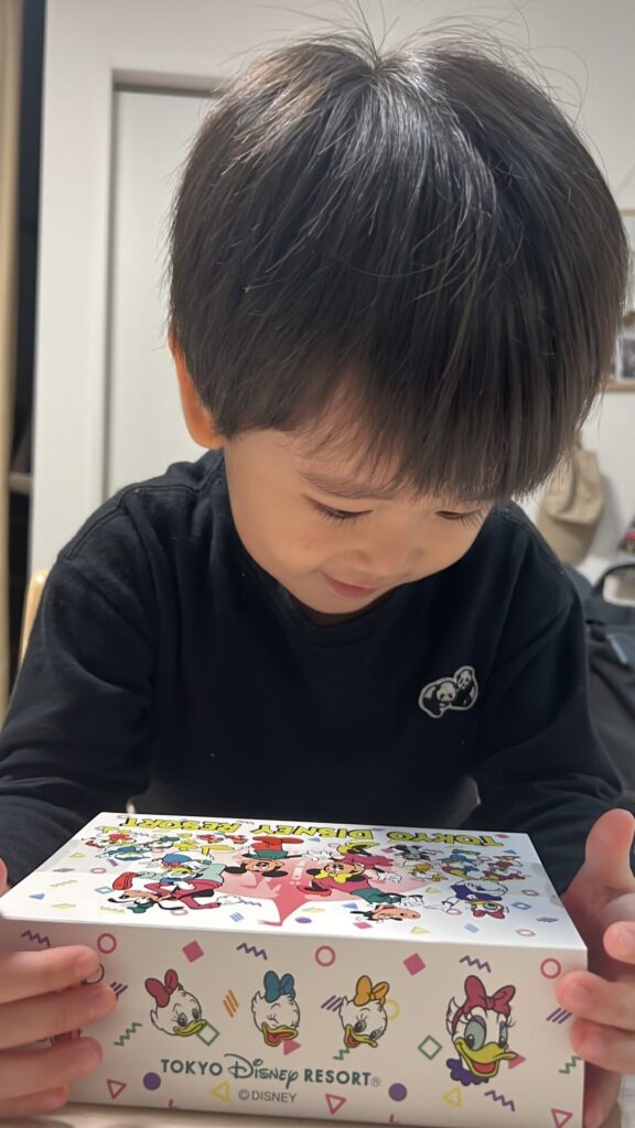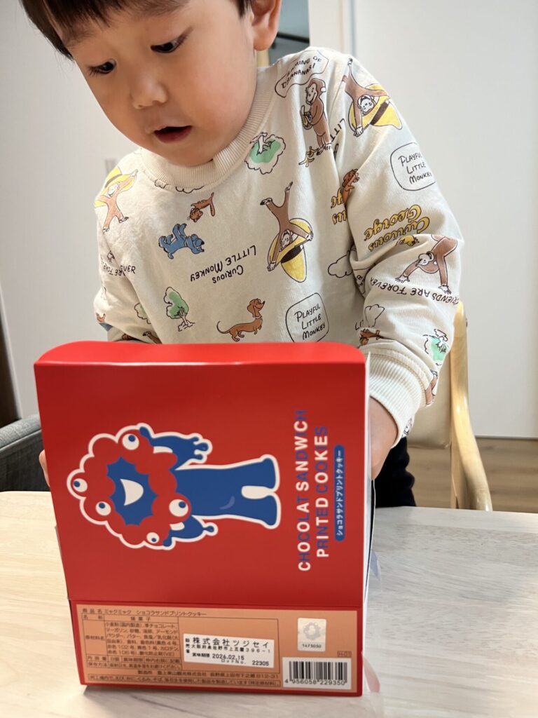 と、ニヤニヤしながら初めて見るミャクミャク戸惑いつつも、早く食べたい!!と箱を早く開けるように要求😂