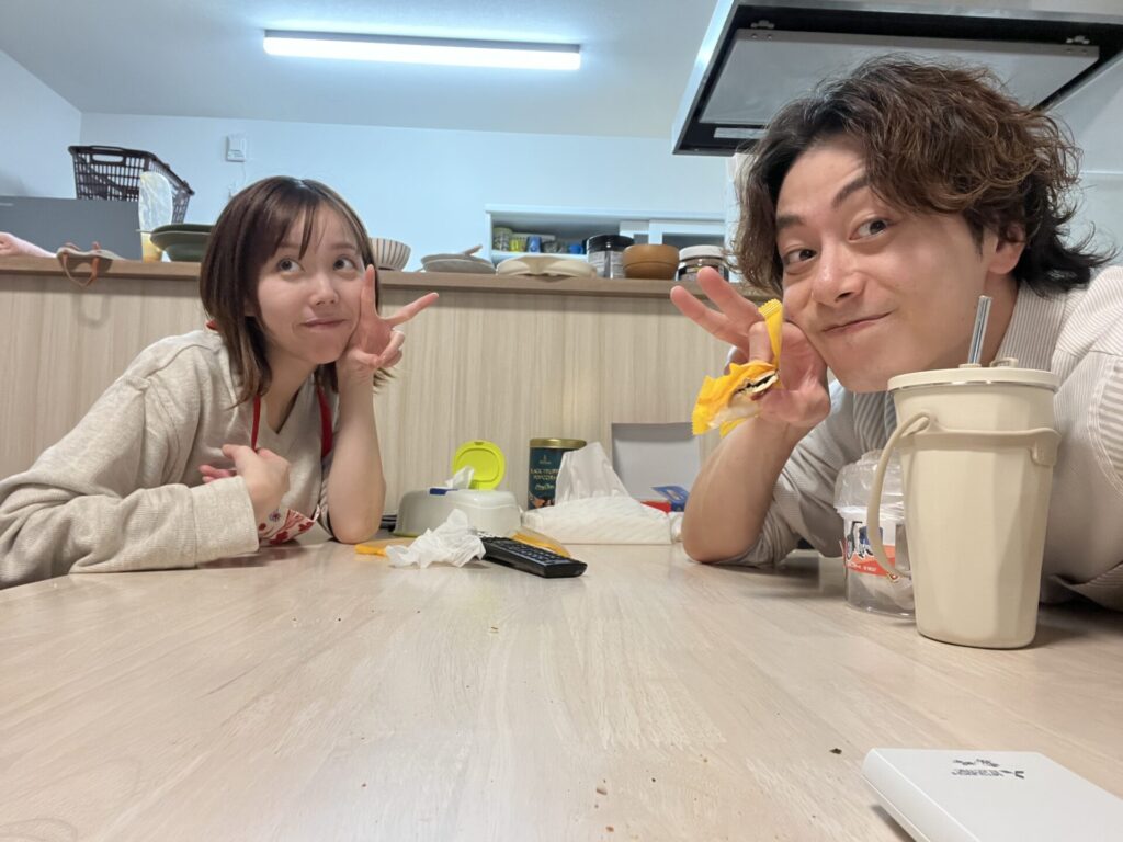 散らかったテーブルで変な顔をしている夫婦写真となってしまいました😂笑