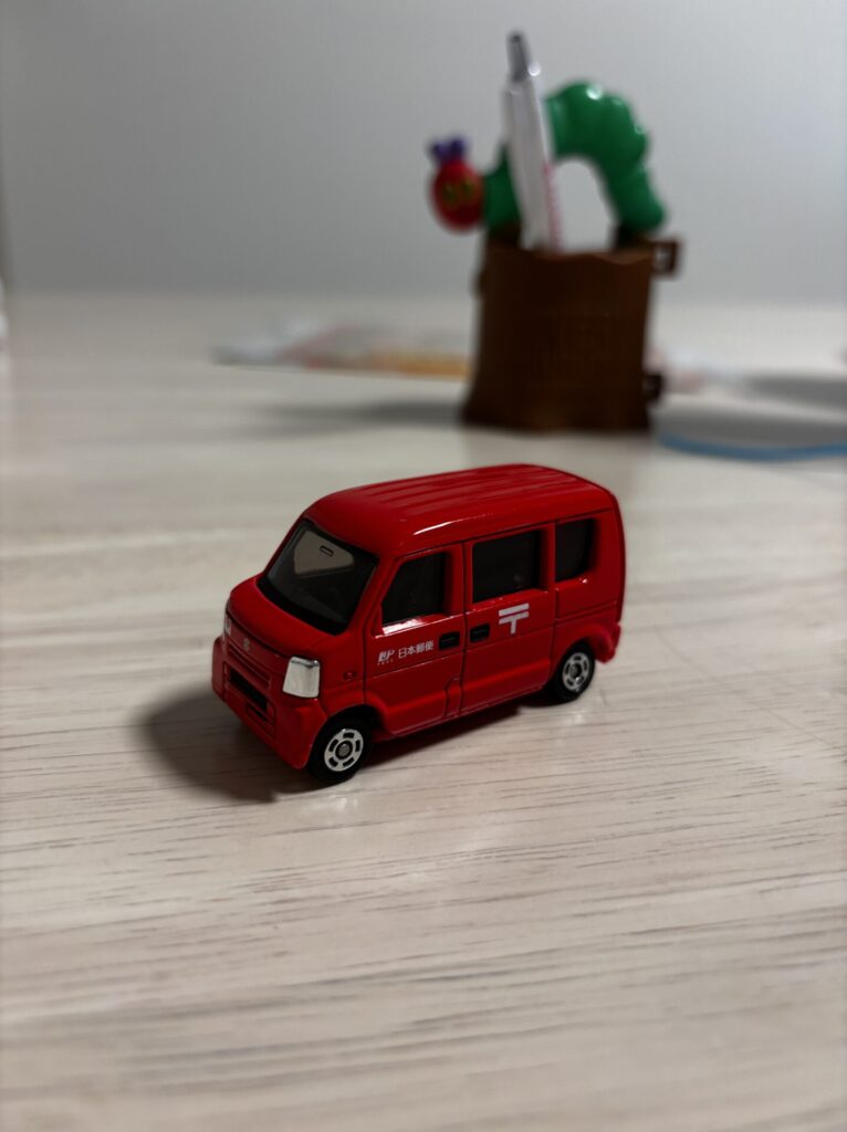 郵便局へ行ってから病院に行くことを伝えると、しっかりおもちゃ郵便車を持つ💪笑