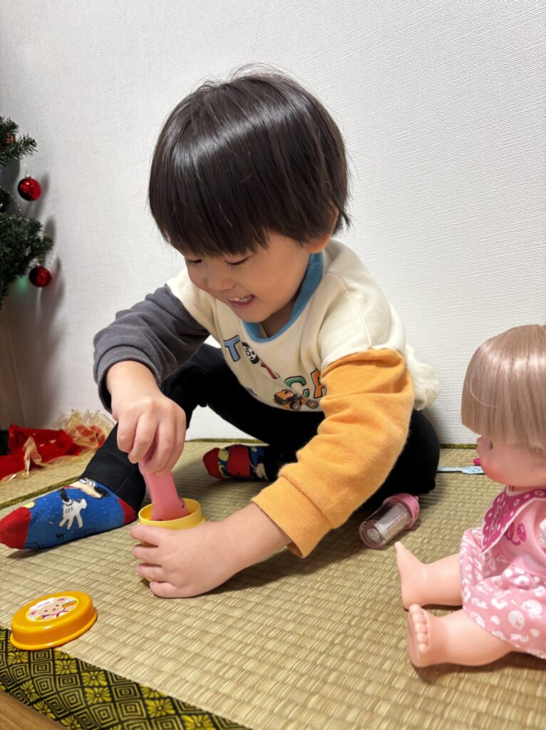一足早いクリスマスプレゼントももらい、パパが帰ってきたら早速メルちゃんを紹介していました🤣