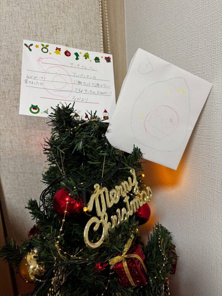 我が家ではクリスマスツリーの下にプレゼントが届くので、サンタさんが分かりやすいクリスマスツリーに手紙を置くことに🎄