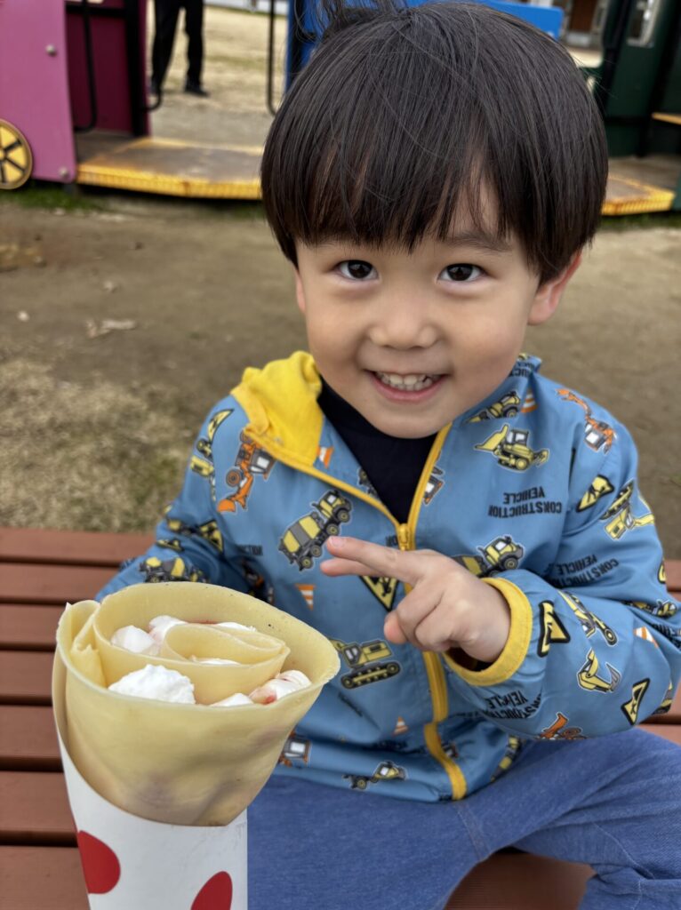 一通り遊んでお腹がすいたので帰ろうとすると、公園にクレープ屋さんが!!