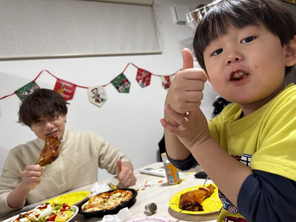 息子も大きなチキンにかぶりつき「ぐー👍」ポーズ🥰
