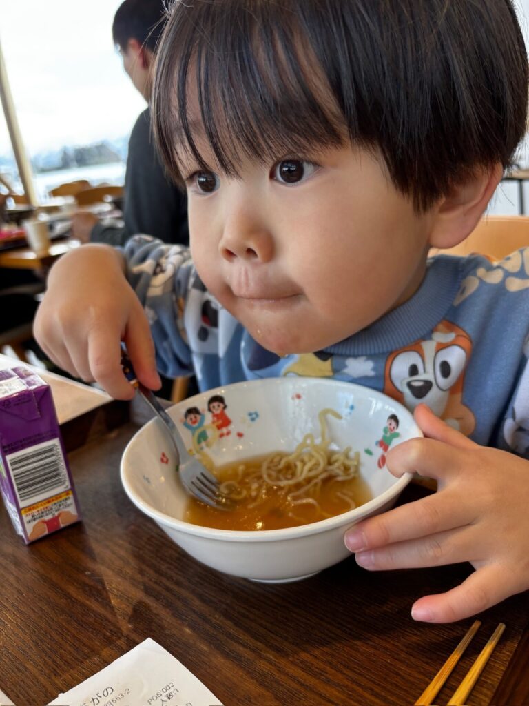 お昼がまだだった息子は室内に戻ってラーメンを食べました!