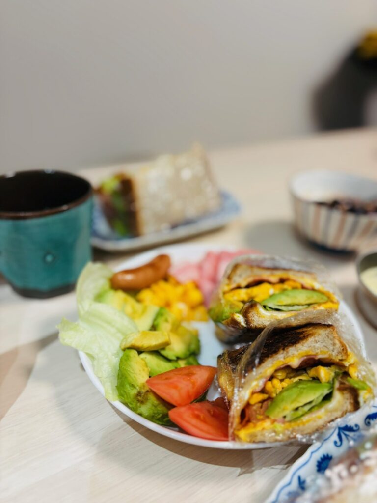 アボカド、卵、ベーコンに加えて、ホットサンドでバターを使用したり、さらに卵とベーコンとチーズのサンド。