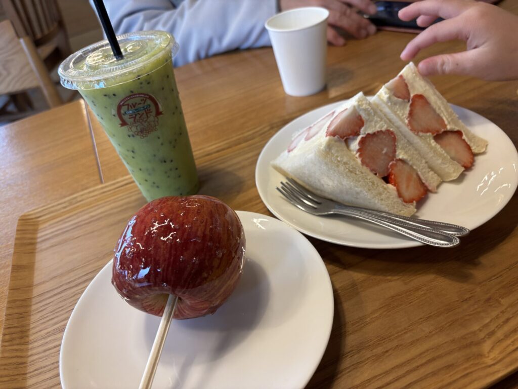 イチゴサンド、キウイジュース、りんご飴を食べました♪