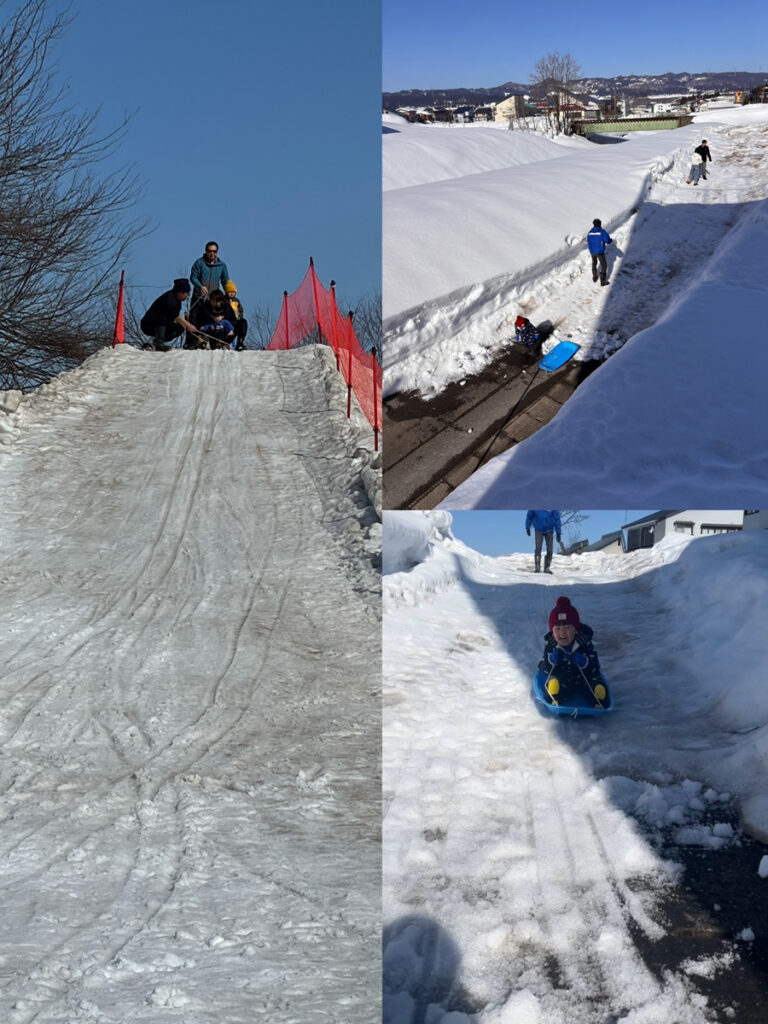 次の日は朝から実家の前の天然滑り台でソリを😆