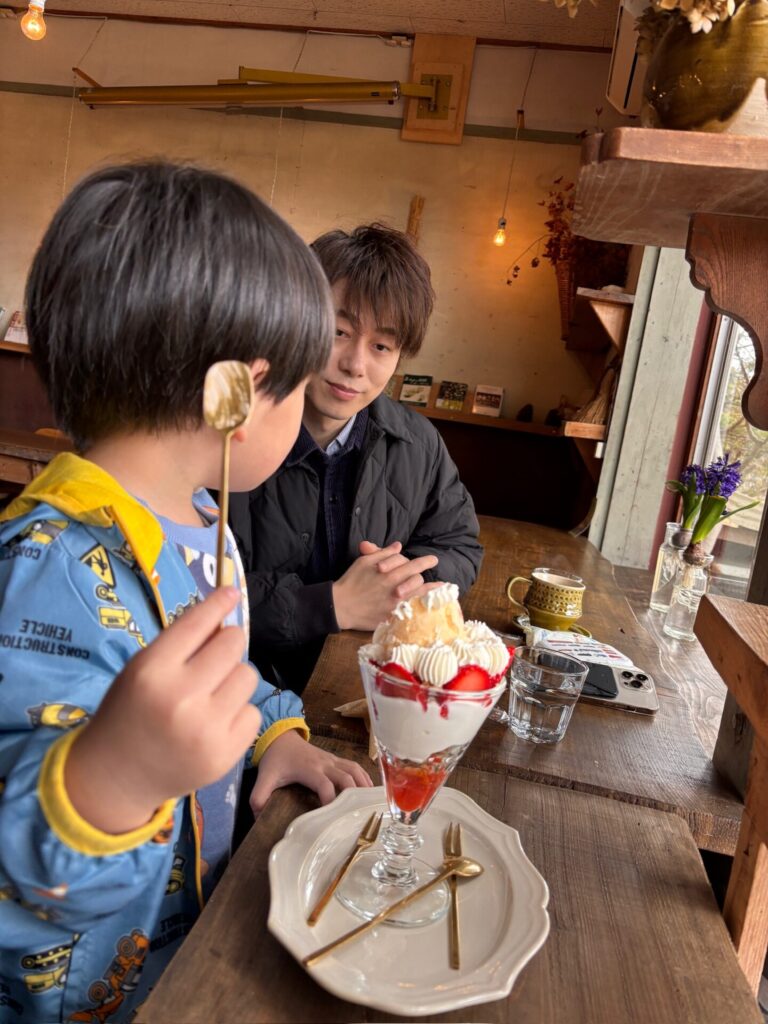 おなかすいてた息子は自分の顔くらいあるイチゴパフェがきて大興奮!!