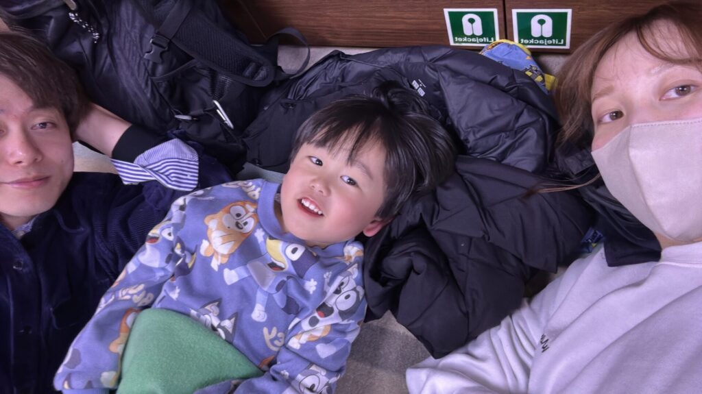 今まではひたすら動き回っていたので二等で横になることはなかったのですが、今回初めてみんなでゴロン♪