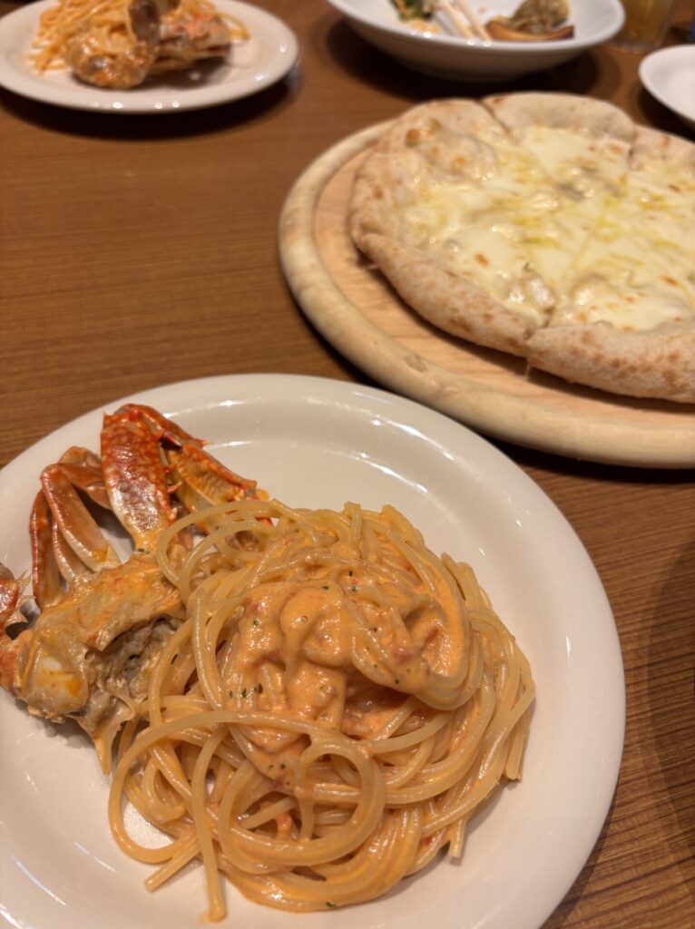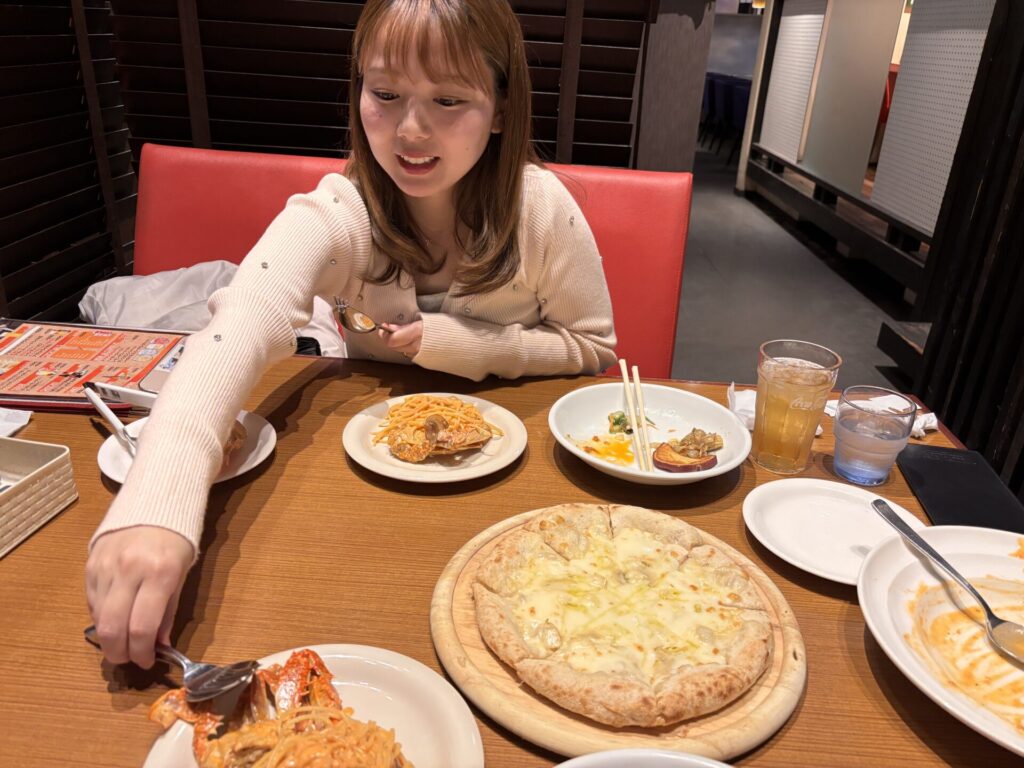 パスタをシェアしてピザはほぼ持ち帰りで…サラダバーで楽しみました😌