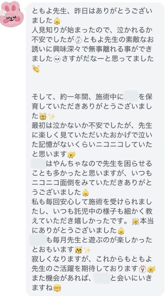ママさんからの温かいメッセージは今回だけでなく託児の度にいただいていて、私自身とても励みになったし、託児の後のお子さんの様子を知ることができ嬉しかったです🥰💖