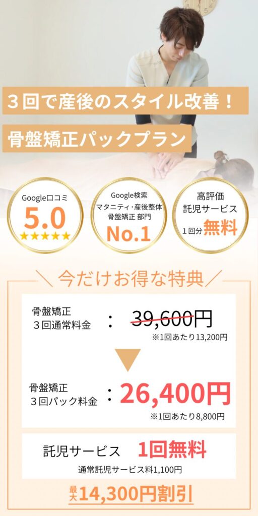 お身体の状態やお子さんの成長など、あなたのライフスタイルに合わせてセルフケアもご提案して3回の骨盤矯正でお悩みを解消します。