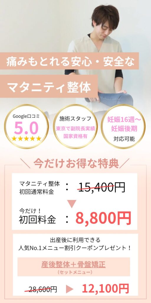 多くの妊婦さんからは「妊娠中も痛みが改善して、安心して妊娠生活を送れた」と嬉しいお言葉をいただいております。