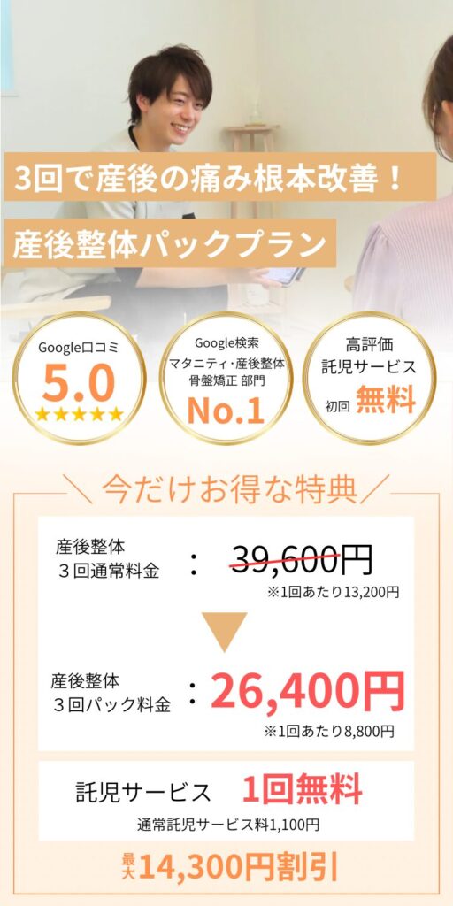 当店で行っている産後整体パックプランは、3回という回数を決め短期間で解消へと導いています。